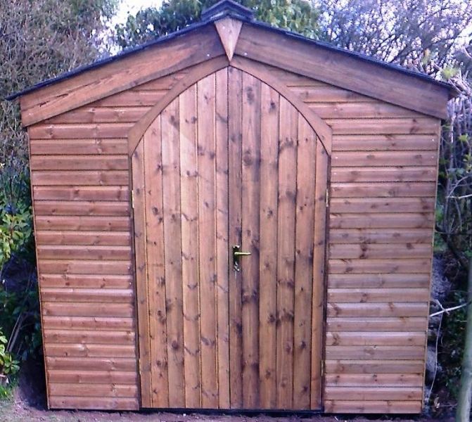 Golden brown cuprinol treated garden building with arched doors to help reduce building height but keep access to a maximum showing the quality & detail of our workmanship and customer service levels.