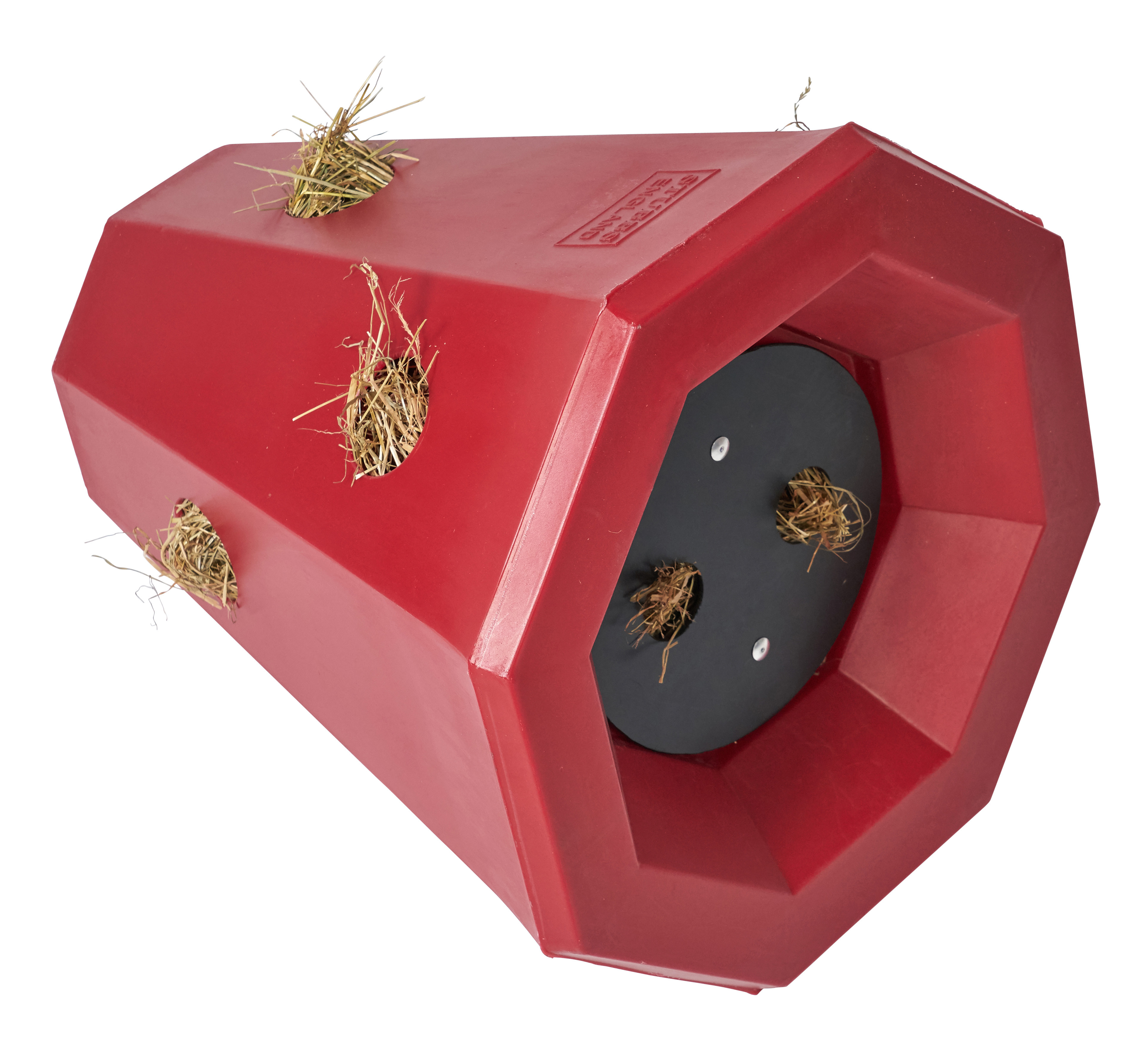 Real feeder with the capacity of a haynet, this is not just a toy! It stops hay blowing around field or getting muddy. Boredom breaker/slow feeder. Conical shape rolls in a small circle, not blowing under a hedge or fence! Doubles as a pole block; underside of pole 60cm - it's already in the field... Horses and ponies love this within seconds and so do their owners. Very easy filling through funnel shaped opening - just push a wedge of hay into the funnel shaped filler. Some horses may eat from the fill end but hay is restricted and still kept clean. One piece construction, there is no lid to lose or break or go wrong! Separate models for horses and ponies - by hole size. Stacks partially nested for freight. Exceptionally durable STUBBYTHENE moulding, tested to -30??_C. Multiple colours - Carrot Orange, Red, Blue, Green Apple Green, Yellow, Pink or Purple. Length: 62cm Small end diameter: 29cm Filling hole: 25cm Large end diameter: 59cm Height under pole: 60cm Feeder holes: 7.5cm