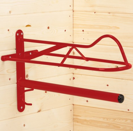 An extended version of our very popular S19 Forward Set Saddle Rack to accomodate the larger Western Saddle. Provided with a pole below for the pad. Stubbyfine coated Red or Black. Height: 42cm Width: 24cm Projection: 62cm